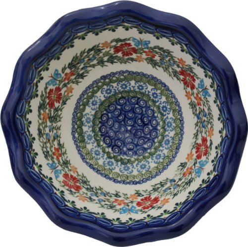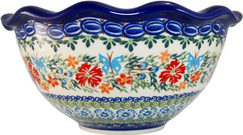 Polish Pottery Ceramika Boleslawiec Bowl Fala Cups, Small, Royal Blue Patterns with Red Cornflower and Blue Butterflies Motif, 5-3/4-Inch